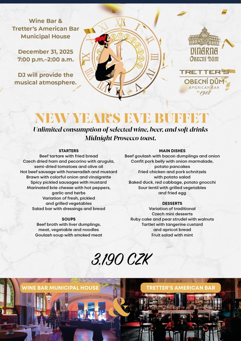 New Year's Eve at the brewery "Pivnice Obecní Dům" is already completely sold out. Due to great interest, we have expanded the offer to include the premises of the Wine Bar & Tretters American Bar, which are also in the basement of the Municipal House.